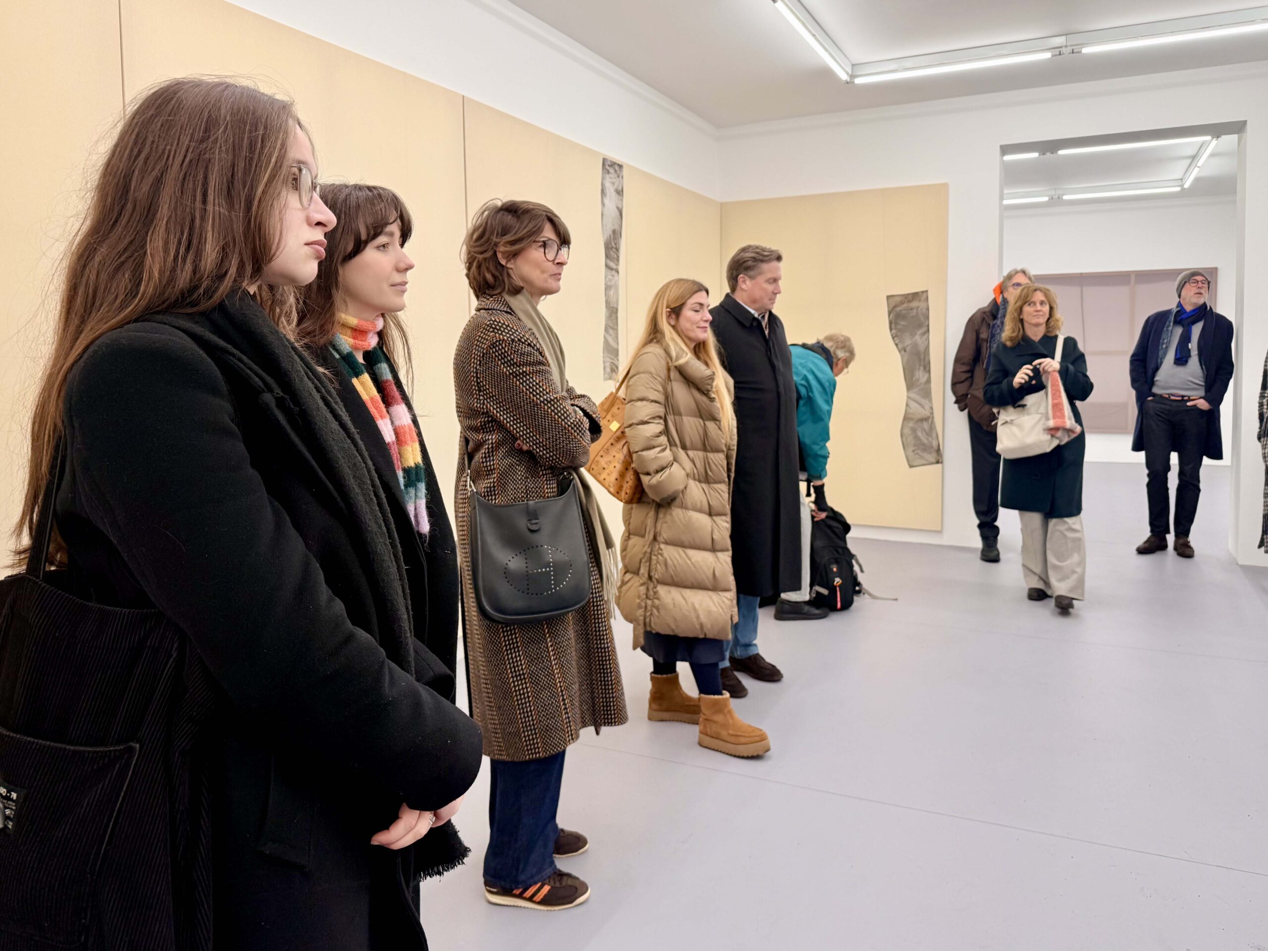 Weiter ging es zur Galerie kajetan. Die Galerie kajetan präsentiert mit Silky Way die erste Einzelausstellung des in Leipzig lebenden Künstlers Minh Dung Vu. Neben zwei kleineren Papierarbeiten zeigt die Ausstellung neue großformatige Textilarbeiten, in denen Vu glänzende, sanft verlaufende Seide mit mattem Leinen verbindet. So verschiebt er die Grenzen zwischen Malerei, Collage und Objekt und erweitert das Bild um eine konsequent materialbasierte Dimension. Seine Werke thematisieren kulturelle Zugehörigkeit, Identität und Erinnerung und zeichnen sich durch subtile, präzise kontrollierte Materialität sowie eine starke Präsenz im Raum aus.