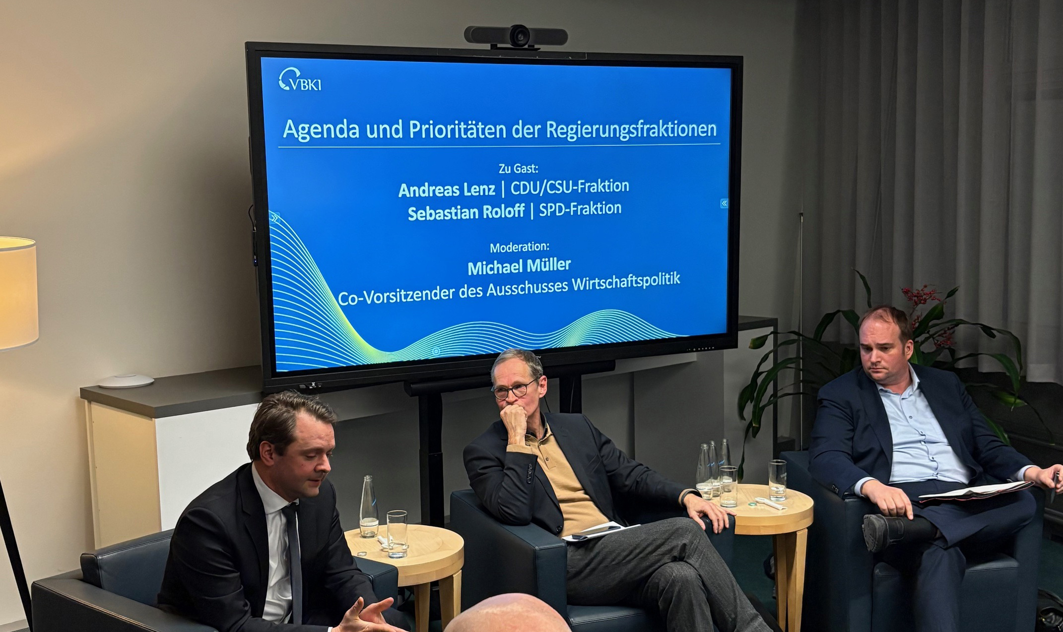 Bei Regierungsübernahme hatte Bundeskanzler Friedrich Merz „Rambozambo“ angekündigt. Doch bislang fehlt eine durchschlagende Strategie, um die deutsche Wirtschaft wieder in Schwung zu bringen. Wird das gerade angebrochene Jahr 2026 endlich die ersehnten Reformen bringen? Im VBKI erläuterten die wirtschaftspolitischen Sprecher der Regierungsfraktionen, namentlich Andreas Lenz (CDU/CSU-Fraktion) und Sebastian Roloff (SPD-Fraktion), die wirtschaftspolitische Agenda der Bundesregierung – und stellten sich im Anschluss den Fragen der VBKI-Mitglieder. Der bewusst klein gehaltene Rahmen ermöglichte einen offenen, intensiven Austausch.